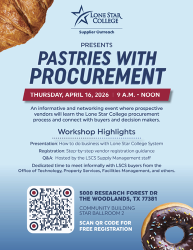 Join Lone Star College System for an informative workshop for current and prospective vendors interested in doing business with LSCS. This session will provide an overview of LSCS procurement processes, step-by-step guidance on vendor registration, and a Q&A with Supply Management staff. Attendees will also have the opportunity to meet informally with LSCS buyers from Technology, Property Services, Facilities Management, and other departments. A continental breakfast will be provided.
